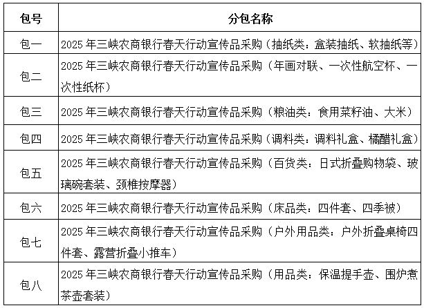 一、項目概況 2025年三峽農(nóng)商銀行春天行動宣傳品采購項目的潛在供應(yīng)商應(yīng)在湖北三峽建設(shè)項目管理股份有限公司(宜昌市發(fā)展大道57-6號三峽云計算大廈A座19樓)獲取采購文件,并于 2024年12月30日09點30分(北京時間)前提交響應(yīng)文件。 二、項目基本情況 1.項目名稱:2025年三峽農(nóng)商銀行春天行動宣傳品采購 2.項目編號:SXJS-CGZB-2024-147 3.方式:競爭性磋商 4.預(yù)算金額:人民幣666760.00元 5.采購內(nèi)容:2025年三峽農(nóng)商銀行春天行動宣傳品采購共八個包,具體分包如下: