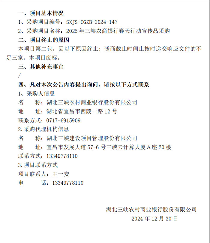 | 2025年三峽農(nóng)商銀行春天行動宣傳品采購(包二) 廢標公告 |