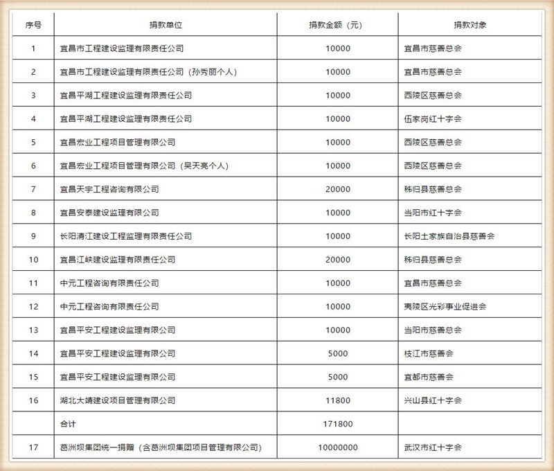 突發(fā)的新型冠狀病毒肺炎疫情讓本應闔家歡樂團聚的鼠年新春佳節(jié)蒙上了悲壯的色彩,眾多的醫(yī)護人員和國家公職人員放棄假日,忘我戮力奮戰(zhàn)在抗擊疫情的第一線??箵粢咔?,不僅是當前黨和政府頭等大事,更得到全國各界社會人士的積極響應和全力支持。 宜昌市監(jiān)理行業(yè)在疫情面前主動作為,自發(fā)踴躍捐款貢獻企業(yè)力量,表現(xiàn)出了高度的社會責任感和守望相助的大愛精神。截止2020年1月31日14時,宜昌監(jiān)理企業(yè)已向我市各級慈善總會及紅十字會捐款共計16萬余元支持疫情防控。 一份份赤誠而熾烈的愛,如涓涓細流般匯聚到全力打贏新型冠狀病毒感染肺炎疫情攻堅戰(zhàn)的洪流當中!眾志成城,齊心協(xié)力,抗擊疫情的勝利必將早日到來! 中國加油!湖北加油!宜昌加油! 部分愛心捐助企業(yè)名單: