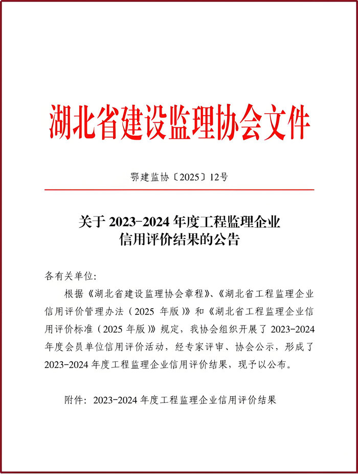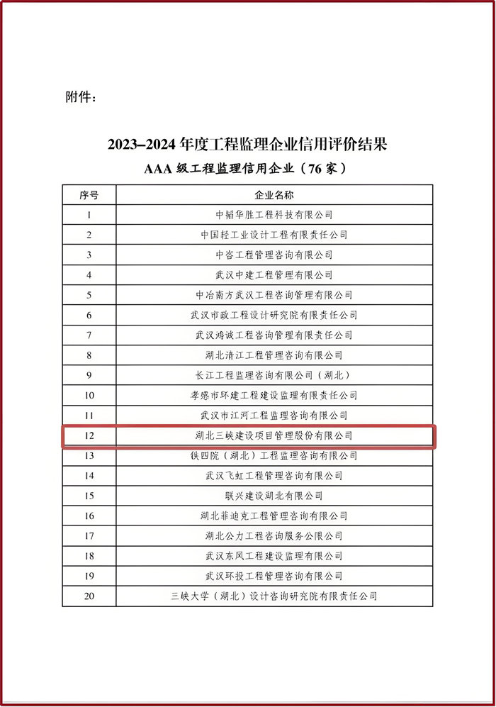 熱烈祝賀湖北三峽建設(shè)項(xiàng)目管理股份有限公司榮獲湖北省建設(shè)監(jiān)理協(xié)會2023-2024年度工程監(jiān)理企業(yè)信用評價結(jié)果 AAA級工程監(jiān)理信用企業(yè)!