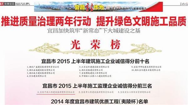 我公司在推進(jìn)“質(zhì)量治理兩年行動(dòng),提升綠色文明施工品質(zhì)”— — 宜昌加快筑牢“新常態(tài)”下大城建設(shè)之基中獲得宜昌市2015 上半年施工監(jiān)理企業(yè)誠信得分第一名,所監(jiān)理的項(xiàng)目中多項(xiàng)榮獲宜昌市住建委2014 年度宜昌市建筑優(yōu)質(zhì)工程(夷陵杯)獎(jiǎng)。